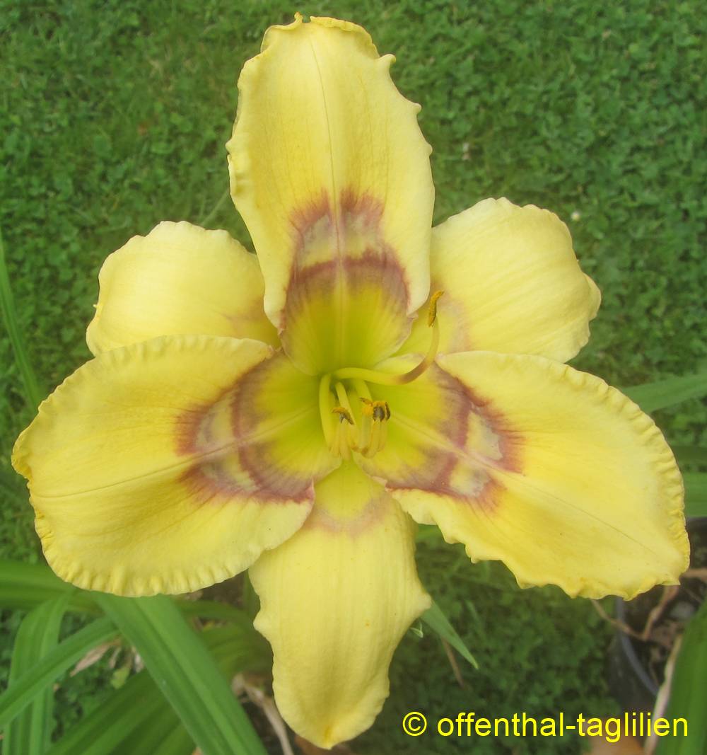 Die Taglilie/Hemerocallis ‚Jinxy‘ hat cremefarbene Blüten mit einem leicht gewellten Rand. Außerdem besitzen diese Blüten ein wundervolles, mehrfarbiges Auge aus purpur und feuersteingrau mit einem grüngelben Schlund •