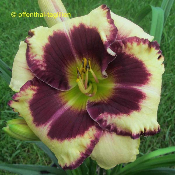 Cremefarben mit schwarzpurpurnem Auge und gleichgefärbtem breiten Rand  •